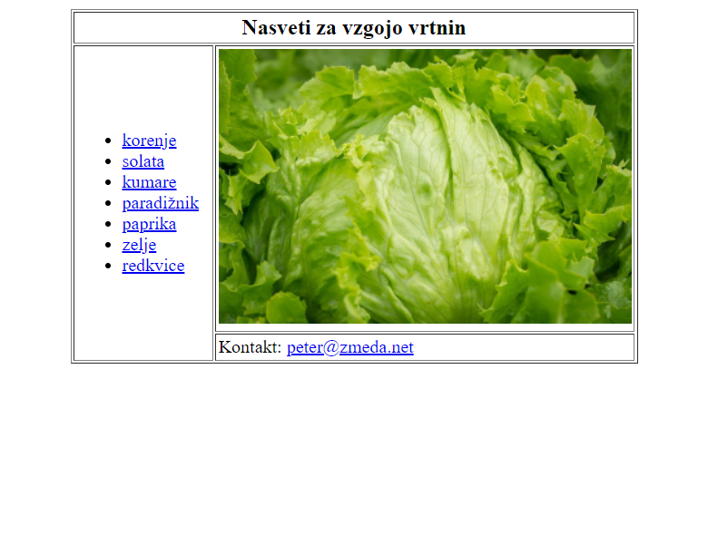 <!DOCTYPE html> <html> <head> <title>Nasveti</title> <meta http-equiv="content-type" content="text/html; charset=UTF-8"> </head> <body> <table border="1" cellpadding="2" cellspacing="2"> <tr align="center"> <td colspan="2" rowspan="1"> <big><b>Nasveti za vzgojo vrtnin</b></big> </td> </tr> <tr> <td colspan="1" rowspan="2" width="25%"> <ul> <li><a href="html/korenje.html">korenje</a></li> <li><a href="html/solata.html">solata</a></li> <li><a href="html/kumare.html">kumare</a></li> <li><a href="html/paradiznik.html">paradižnik</a></li> <li><a href="html/paprika.html">paprika</a></li> <li><a href="html/zelje.html">zelje</a></li> <li><a href="html/redkvice.html">redkvice</a></li> </ul> </td> <td> <img alt="solata" src="slike/solata.jpg" width="100%" /> </td> </tr> <tr> <td> Kontakt: <a href="mailto:peter@zmeda.net">peter@zmeda.net</a> </td> </tr> </table> </body> </html>